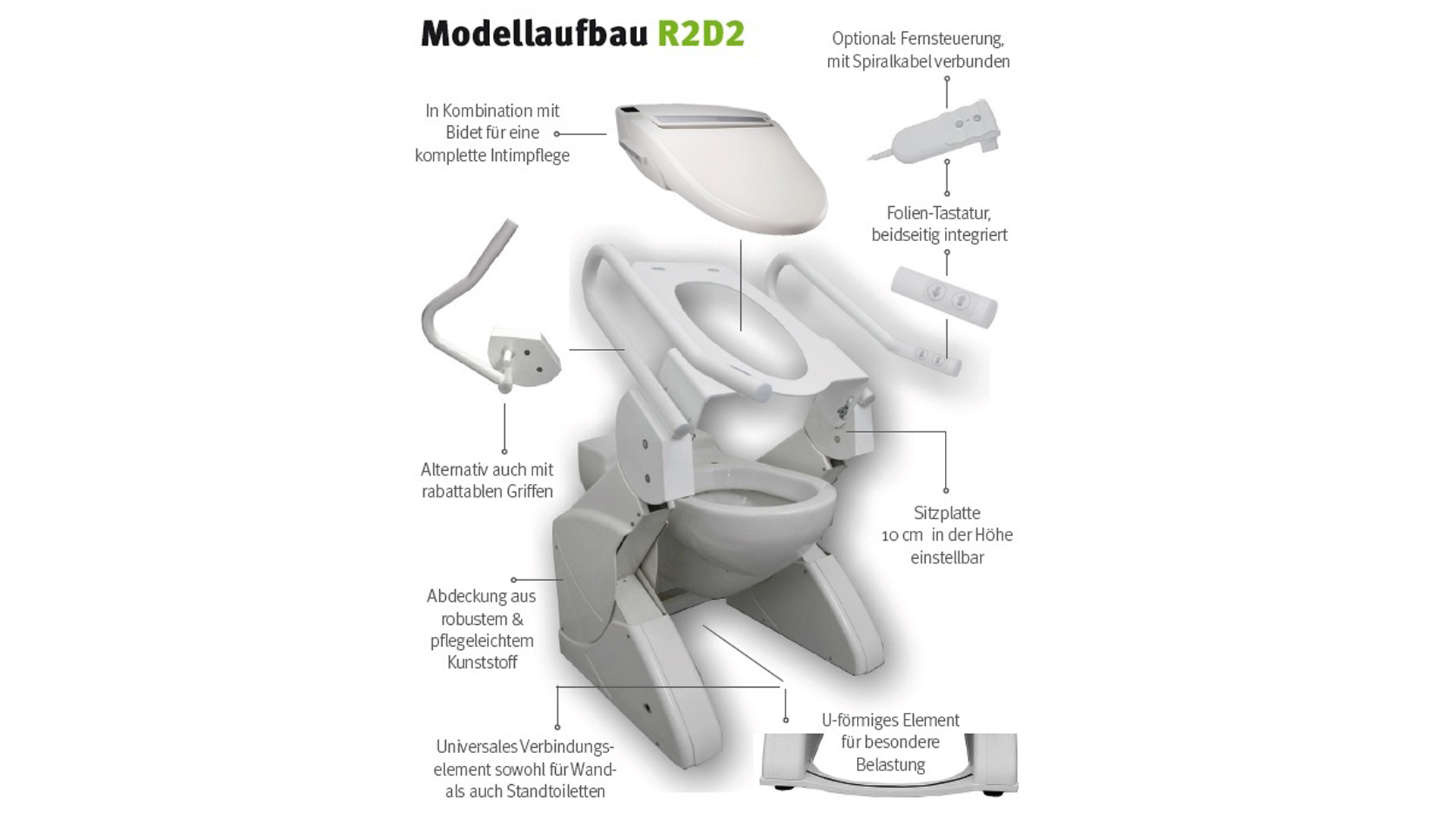 Bei der elektrischen Setz- und Aufstehhilfe R2D2 handelt es sich um ein Hilfsmittel für Menschen, die aufgrund Ihres Alters oder einer körperlichen Behinderung in ihrer Bewegungsfreiheit eingeschränkt sind. Sie eignet sich für Stand- und Wandtoiletten, jedes Modell wird individuell angefertigt. Die Aufstehhilfe ist mit beweglichen und fixen Griffen, alternativ auch mit vertikaler Hebewirkung (R2D2-V) ausführbar. Letztere ist für Rollstuhlfahrer und Personen geeignet, die keinen Neigungswinkel beim Aufstehen und Hinsetzen erfahren dürfen, also eine waagerechte Hebewirkung benötigen.