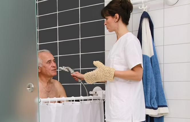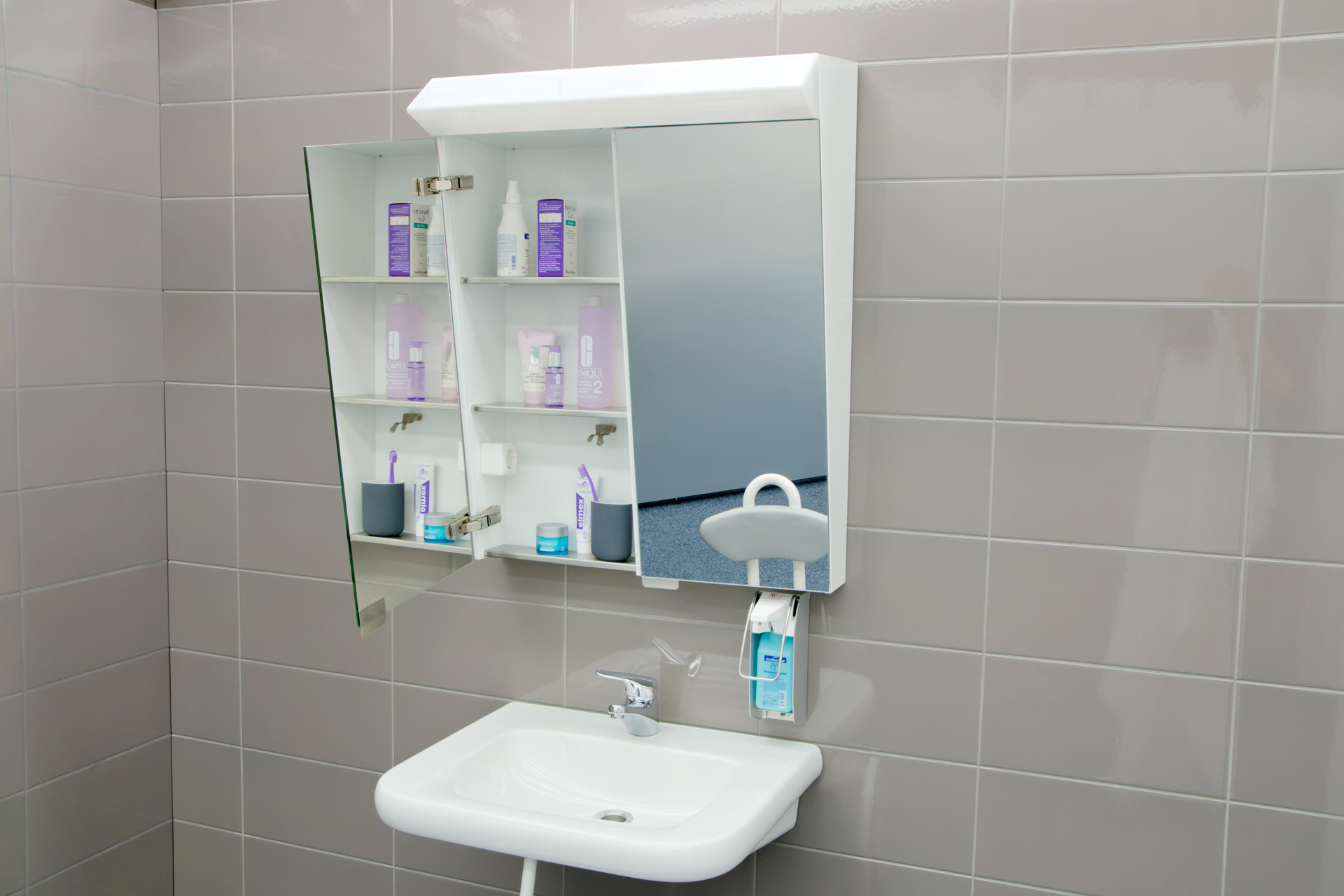 Vorteil: Die Doppel-Spiegeltür kann während des Waschvorgangs für den Benutzer geöffnet bleiben, denn auf der geschlossenen Seite, ist es dem Benutzer weiterhin möglich, sich im Spiegel zu betrachten. Eine angenehm niedrige Zugriffshöhe erleichtert die Erreichbarkeit der im Schrank deponierten Gegenstände. Pflegende werden entlastet und sparen Zeit.